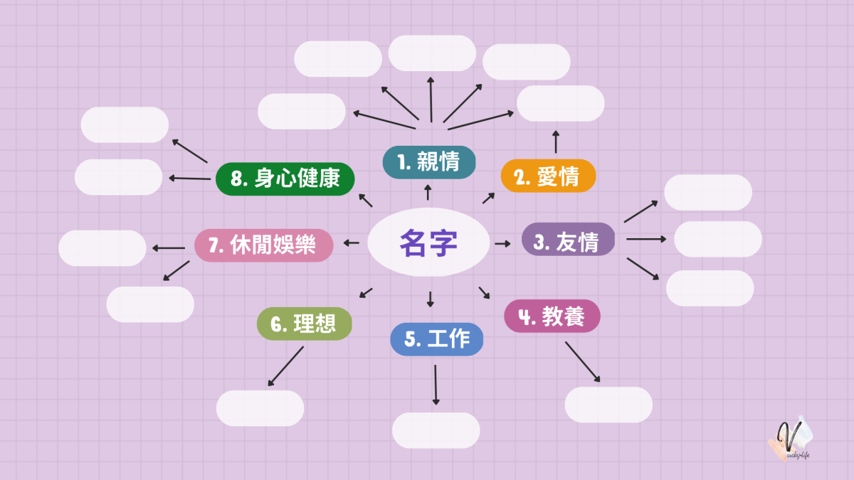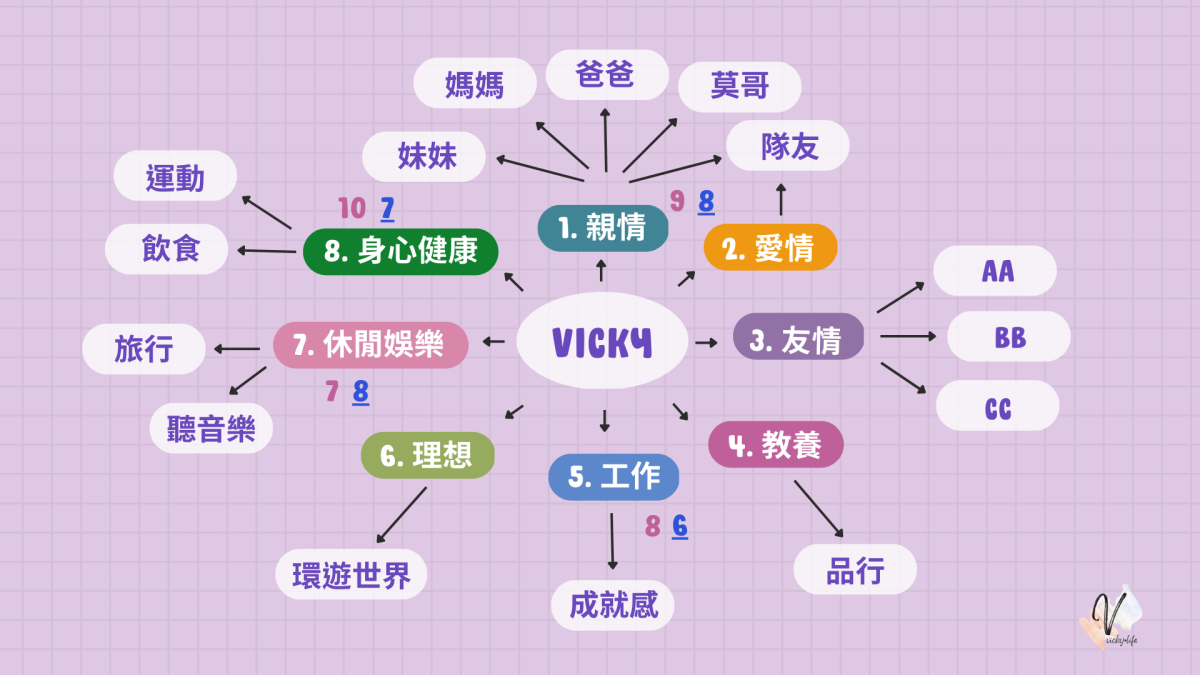- 列出8個項目-親情、愛情、友情、教養、工作、理想、休閒娛樂、身心健康