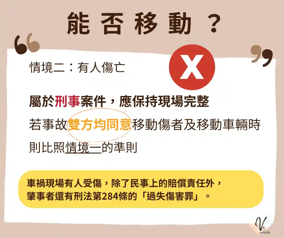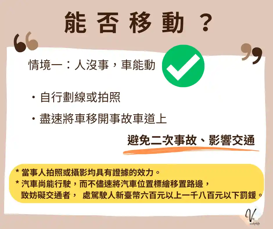也是因為上了這堂課,才知道原來不是我以為的發生車禍時就得保持現場,完全不能移動,要是符合可移動條件,還可能因為沒這麼做被罰鍰呢,至於該怎麼判定能否移動呢?可參考下圖: