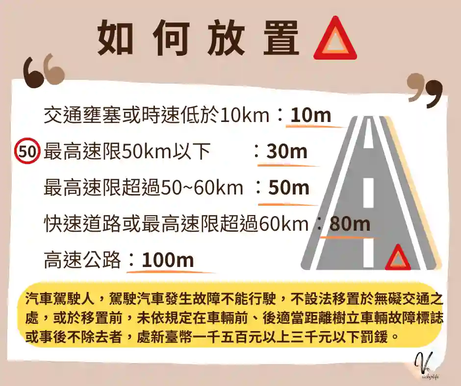‧放置三角警示牌比看傷者更重要,且需「馬上豎立」,若不豎立後續引起的事故,需負擔民事及刑事的相關責任