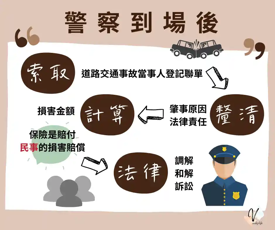 大家都還記得前面提到,有受傷的情況就得報警,那待警察到現場後,又需要做什處理程序呢?