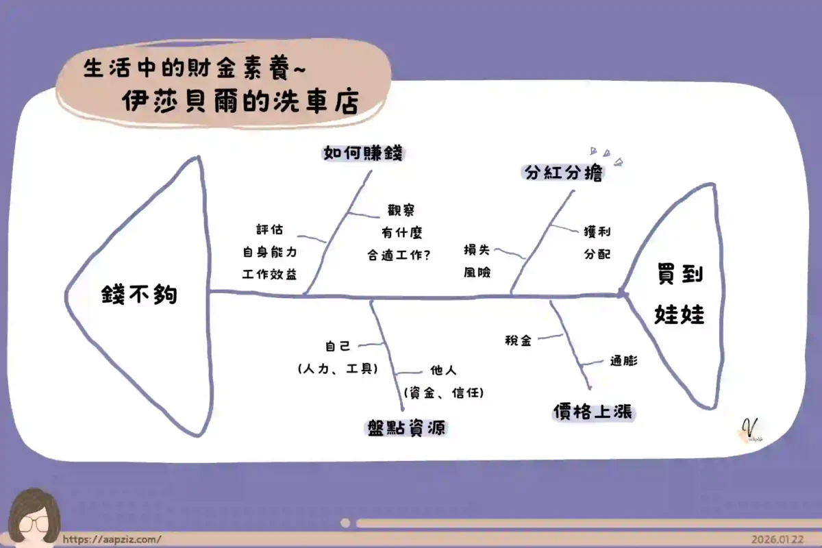 上次在《波塞芬公主的賺錢妙招》應該就讓小孩感受到賺錢其實是件蠻不容易的事,而這本書更從賺錢做生意帶到投資的觀念,而且是透過主角伊莎貝爾很想買娃娃卻發現錢不夠開始,當她發現錢不夠,開始想著可以怎麼有更多的錢而開啟故事的發展,我用魚骨圖的方式,將其中遇到的幾個問題列出來-如何賺錢?盤點資源、分紅分擔、價格上漲,至於解方的部份,大家可以自行翻閱這本書,我覺得光這幾個方向就可以跟小孩開放式討論聊很久了,像是可以觀察有什麼工作能做?也要評估自己的能力及工作的效益,另外我們可以盤點身邊的資源有哪些?另外在投資那一塊我覺得比較特別,兒童財商繪本比較少會介紹到,有的話比較多是教學式的方式說明,而這本書用故事的發展,很自然就帶到了獲利如何分配?可能承擔損失風險的觀念,另外也有提到伊莎貝爾好不容易存到錢要買娃娃時,卻遇到稅的問題,錢差點不夠,我們也可以趁機跟孩子聊到通膨的狀況,書中的狀況及解方都不一定是標準的答案,但開啟親子之間能夠討論理財的話題,推薦大家可以一塊共讀。