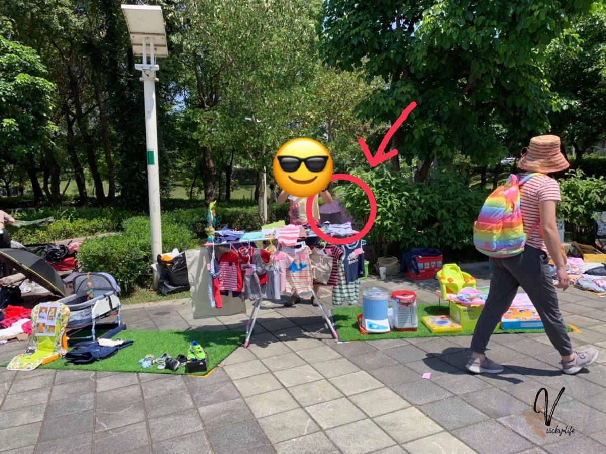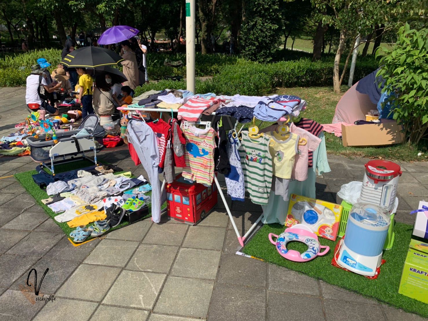 原本想像的畫面是一家三口一起顧攤位叫賣,攤位旁再搭個小帳蓬累了就可進去休息野餐,實際卻不是這番景象!一直嚷嚷要當小老闆的莫哥只想找地方躲太陽,好在我們攤位後方還有樹,便將帳篷移至樹蔭下,也因此莫哥完全離開我們的視線範圍。