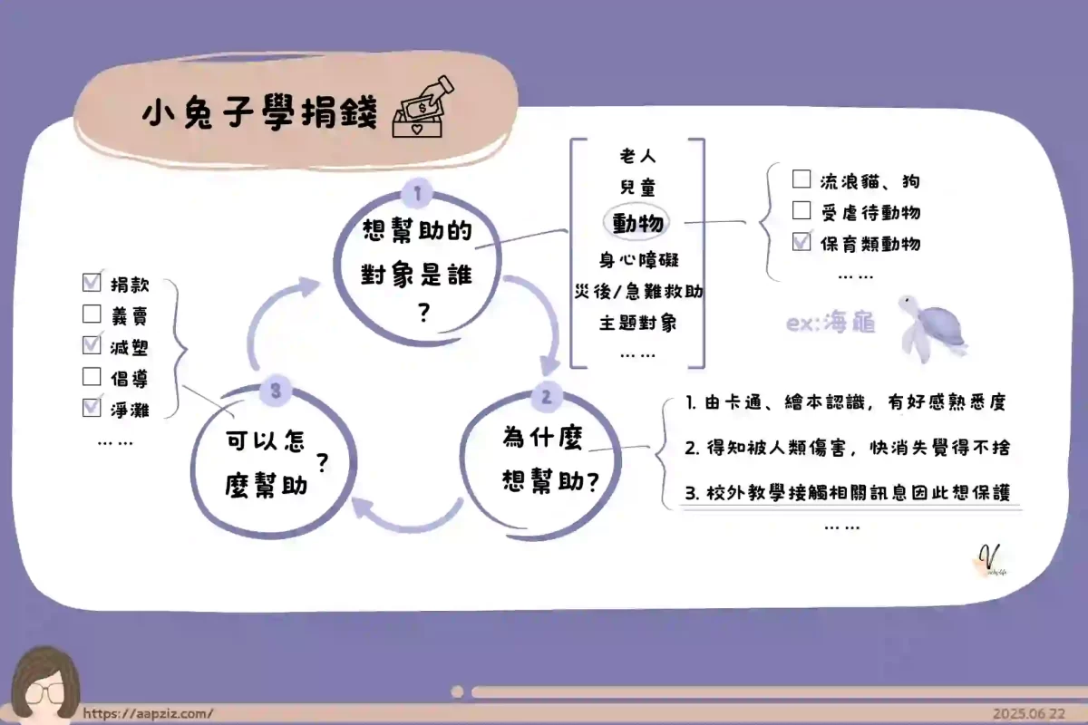 小兔子恰米想當超級英雄拯救世界,經由奶奶的引導,他明白要先確認想幫助的對象是誰?接著也可以與孩子討論為什麼會想幫助(對象)?以及可以怎樣幫助?如上圖所舉例,我們可以先與孩子聊聊想幫助的對象是誰?比如孩子想幫助動物,可以與他討論細分是什麼樣的動物?是流浪狗、還是受虐動物或者保育動物呢?如果是保育類的動物又是哪種呢?例如海龜,那為什麼會想幫助海龜呢?我們可以瞭解孩子想幫助的原因,並進一步聊聊可以用什麼方式去幫助?比如捐款、減塑、淨灘……