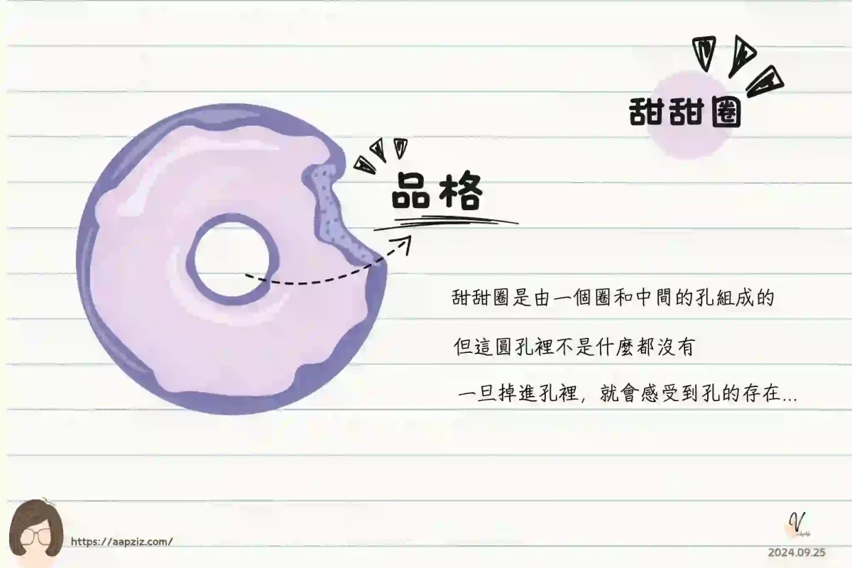 「人生是一場旅行,它永遠向前。我們大多數人先是向外,努力去打造甜甜圈外面的圈;上學、找工作、租房子或買房子,買車、存款或投資……到了人生的某個轉捩點,有些人的旅程開始向內,他們開始鍛鍊自己的內在,關注自己的品格,這就是甜甜圈的孔。」