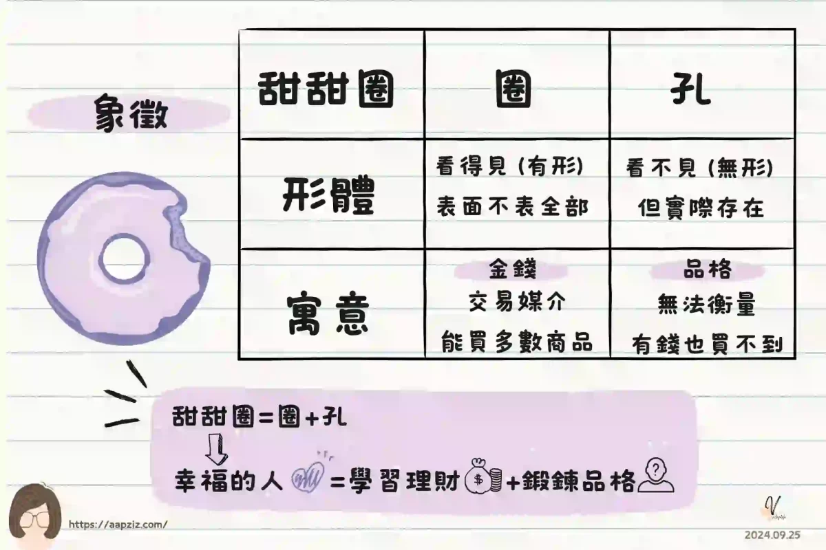 無形的東西很容易讓我們忽視,但往往是更重要的部份,像呼吸、健康、道德、品格等等,雖然我還沒看過《小狗錢錢》,大概猜的出那是一本在教大家如何使用富人思維、正確使用金錢的書,所以我想,作著是希望當大家擁有了外在的圈時,別忘了更重要是內在的孔,也就是《小狗錢錢2》想帶給大家的-金錢品格,而能夠幸福的秘訣就是甜甜圈,希望大家有機會也能閱讀這本優質的寶典。