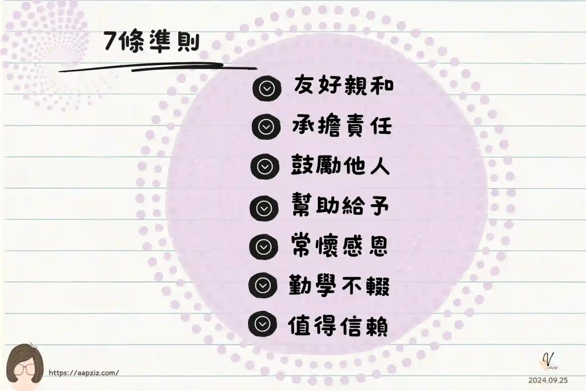 書中提到七條準則就是培養好品格的秘訣,開始還覺得怎麼和《與成功有約》的七個習慣一樣,這麼恰巧都是7這個數字,還笑了一下果真是深受外國人喜愛的Lucky 7呢!沒想到好老師會提醒自己每天關注一張卡片,去身體力行讓潛意識融入成天性,才驚覺原來一週7天,是可以這樣去搭配使用,真是個好方法呀!所以若能將《與成功有約》的七個習慣也照這方式去執行,相信就會是個擁有好品格的成功之人。