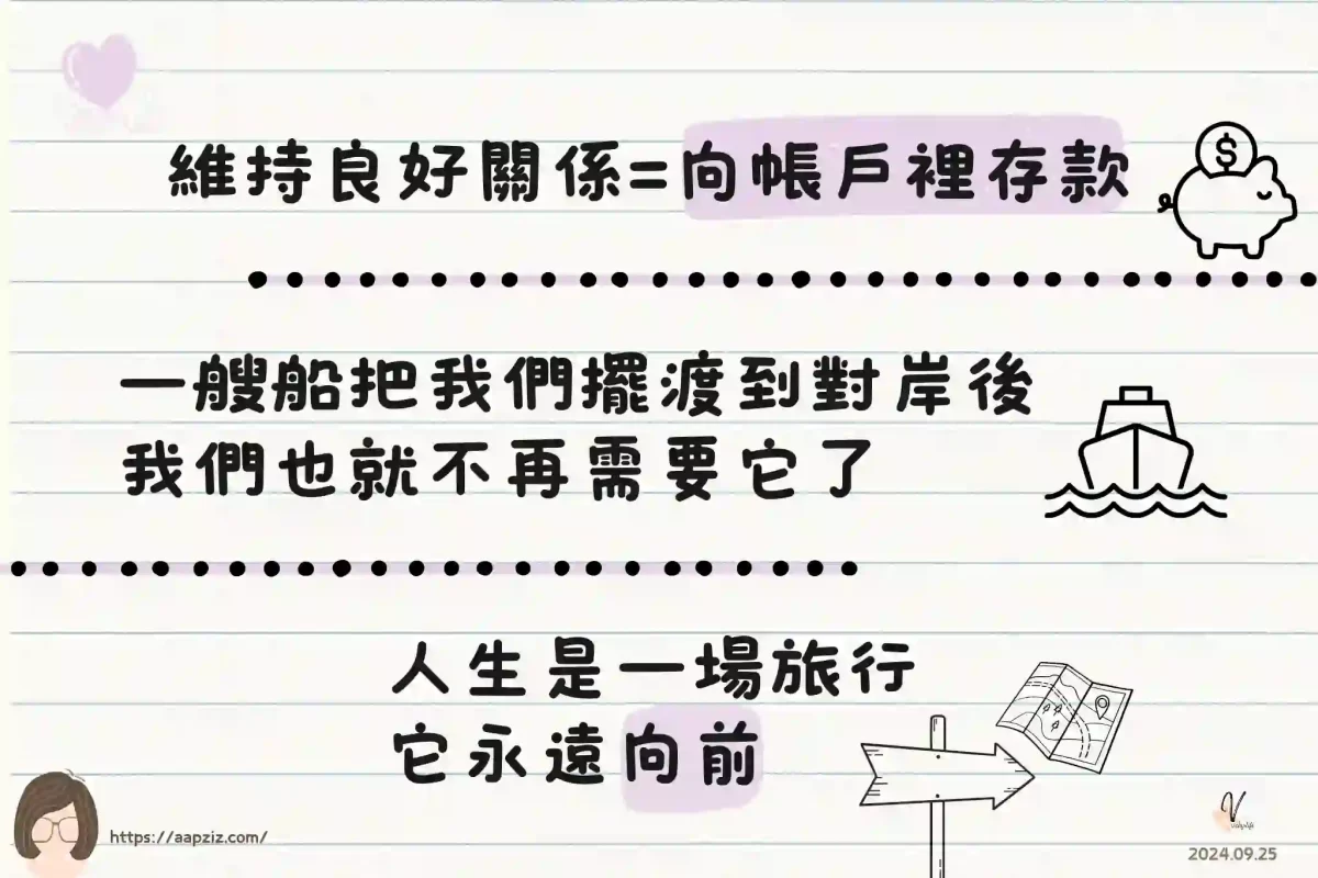 「我們可以把人際關係視作一種銀行帳戶,而維持一段良好關係的成功秘訣就是向帳戶裡『存款』,因為沒有人可以長期不『提款』」。