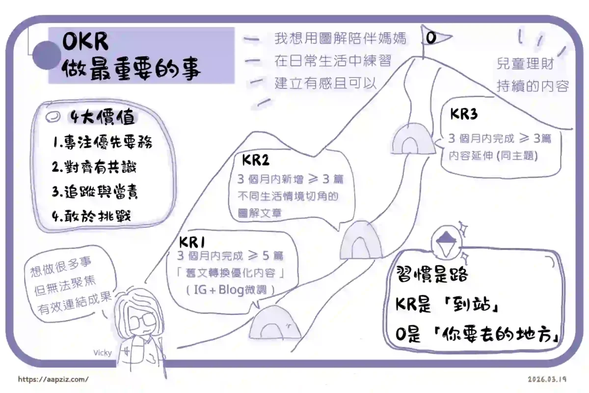 KR是用來判定你如何達成了?所以需要設定量化成果、里程碑、頻率、達成率……等來讓自己知道是不是快到山頂了?經提醒才知道KR指的是結果,而不是行動,而我自己就是常常困在行動之中,沒去看結果,因此這次藉由這樣的練習,我也為設定出自己的OKR,希望真的能夠朝著這方向努力的爬上山頂去,如同課堂中分享的這段:習慣是路,KR 是「到站」,O 是「你要去的地方」,也願大家都能因此更知道如何設定出自己專屬的OKR。