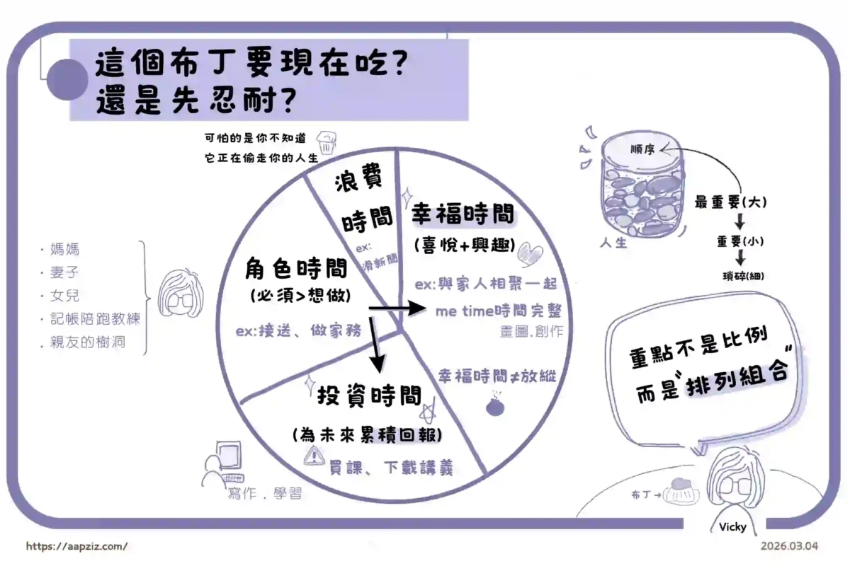 這一區塊其實最容易消耗了,因為很多事情未必是自己想做,但卻必須承擔,例如工作、家庭、照顧他人,有的時候角色時間會讓人覺得比例失控,甚至覺得沒有意義。但換個角度想,角色時間也未必只能是消耗性質,像我就喜歡在曬衣服、做家事的時候,一邊聽 Podcast學習,或是和家人聊天,當我們願意調整時,角色時間也有可能變成幸福時間,甚至是投資時間,我覺得心情也會很不一樣。