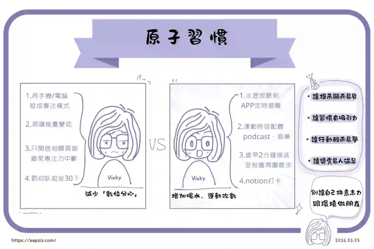 書裡提到「兩分鐘法則」,也就是讓事情小到可以立刻開始,就像郝哥給自己設定的不是達標就是超標,另外也可以降低摩擦力,例如提前準備需要的東西、很多時候持續有做,其實比完美更重要。