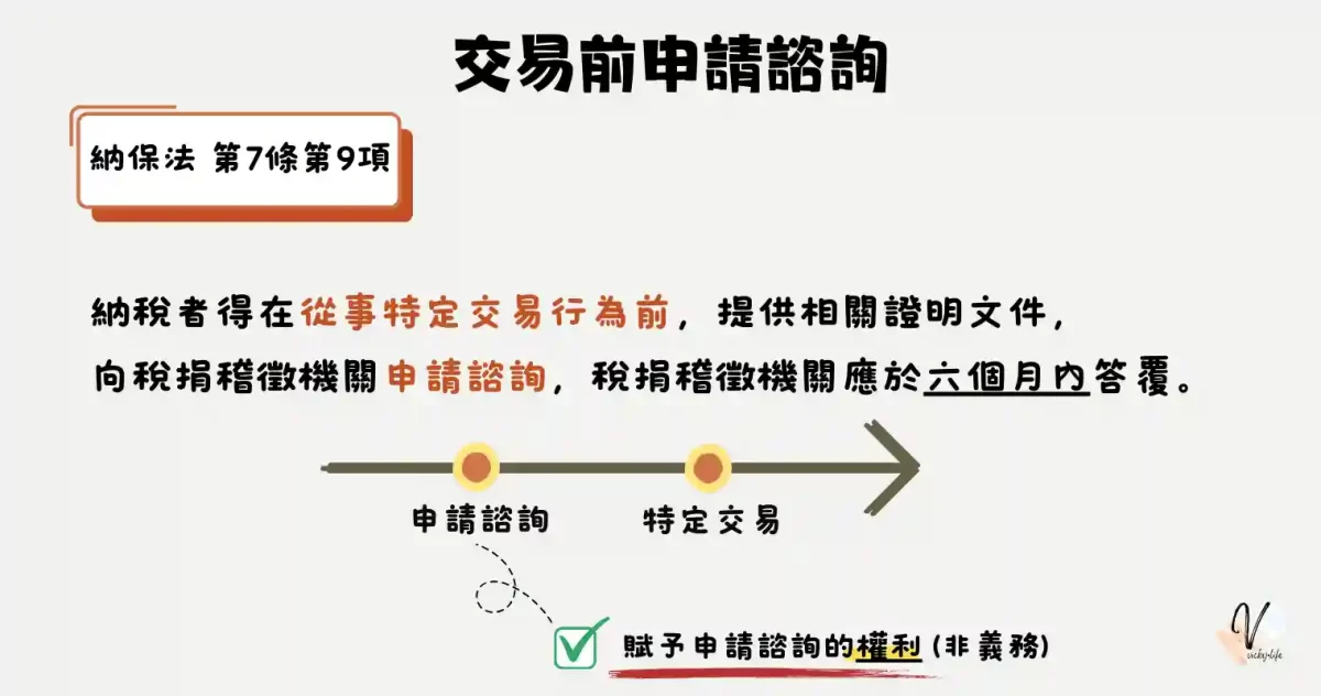 如果納稅人不確定,可在從事特定交易前提供相關證明文件向稅捐稽徵機關申請諮詢,這部份屬我們的權利可以利用喔,詳細可參考下圖: