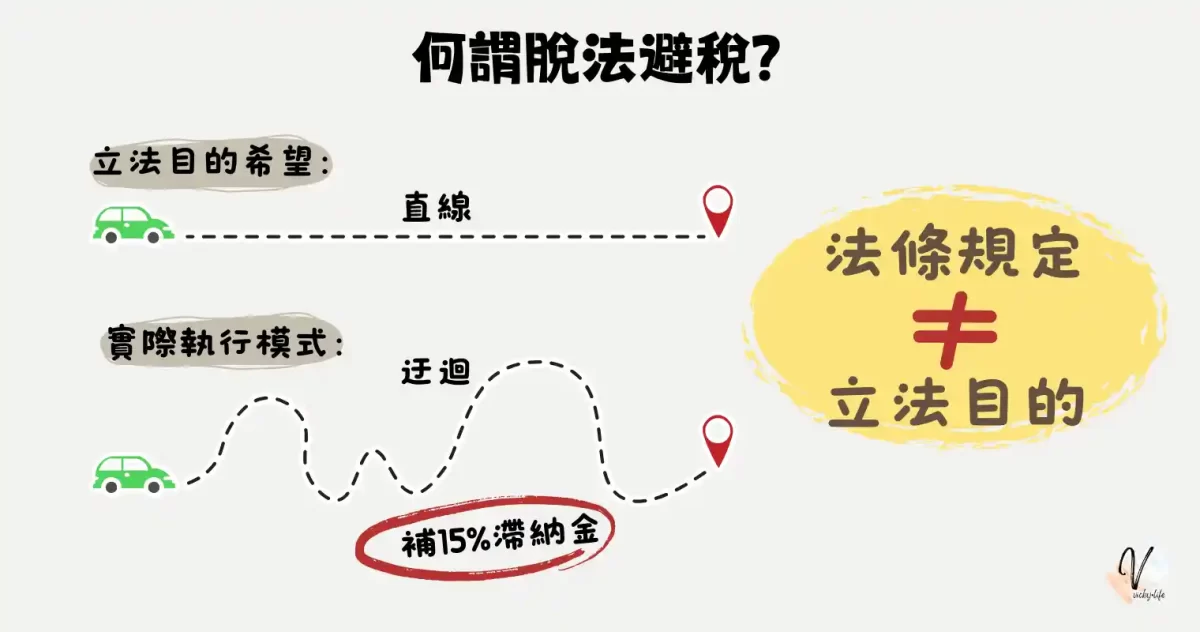 法規希望我們能夠直線抵達(直接),當我們是使用迂迴的方式抵達,就不符合立法的目的,這時就算是避稅,參考下圖: