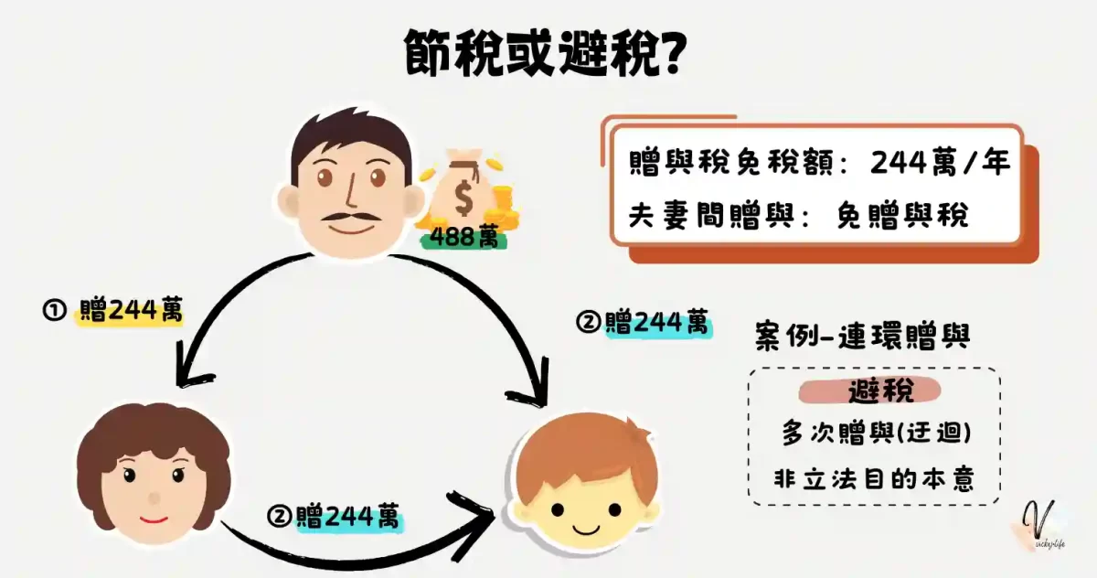 陳先生持有488萬想贈與給小孩,因每年贈與免稅額額度為244萬、夫妻之間免贈與稅,故先贈244萬給太太,自己與太太再分別贈與244萬給小孩,請問這樣算是節稅或避稅呢?