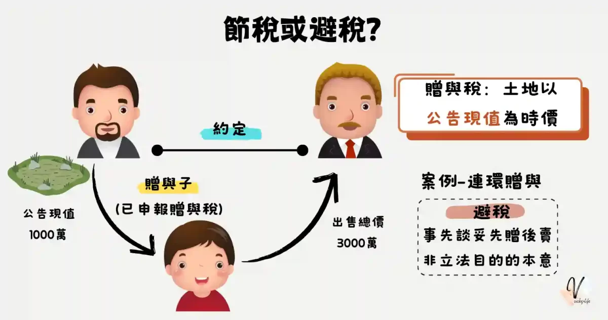 王先生與張老闆約定好將自己的土地以3000萬出售,土地公告現值為1000萬,先將土地贈與兒子,再用兒子名義以3000萬出售這塊土地給張老闆,請問這樣算是節稅或避稅呢?