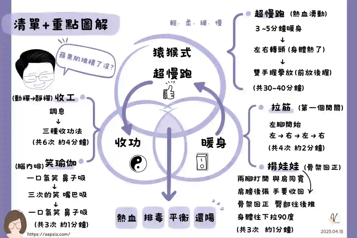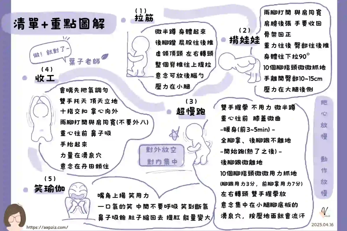 繼上次試著將金句圖解+比較圖解融合在一起成從外從內大不同。於是昨日畫了第六週的圖解大挑戰後也興起了把05清單圖解+06重點圖解做個綜合的念頭。所以又畫了兩張猿猴式超慢跑的步驟及簡略的注意事項,在此也與大家分享: